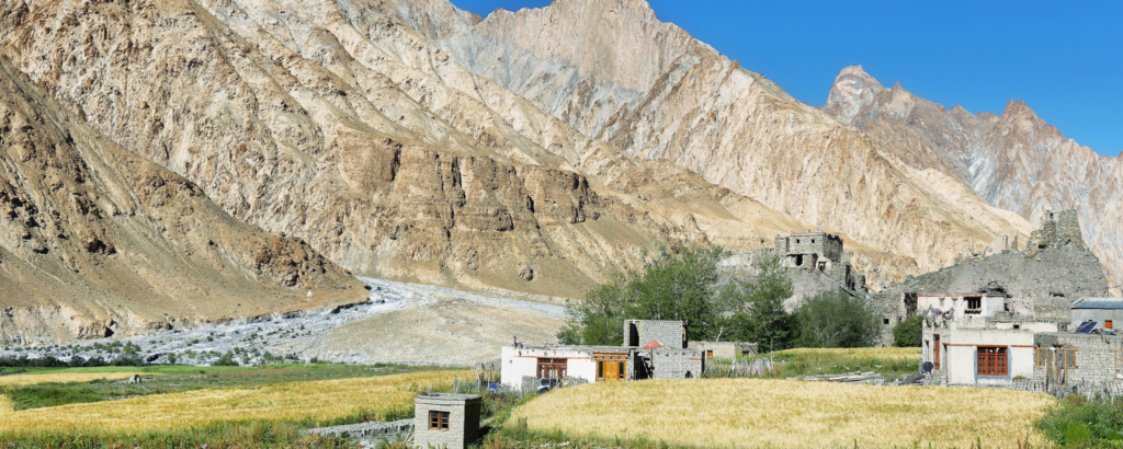 The trail continues through a series of willow and gorse thickets to a bridge over the Markha River. Trekking along the Markha River we get stunning views of the valley below. We will cross the river at and reach Markha (3800m). Markha is the largest village in the valley, consisting of around 20 houses, an old monastery and a ruined fort.